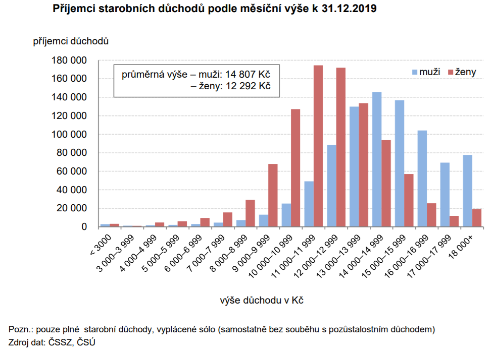 Podle údajů Českého statistického úřadu pobíralo u nás k 31. 12. 2019 starobní důchod 2 407 000 osob, z toho 956 000 mužů a 1 451 000 žen. V porovnání s rokem 2000 je to o celých o 306 000 důchodců více. Počet seniorů pobírajících starobní důchod se tedy neustále zvyšuje. Nejen vlivem stárnutí populace, ale také proto, že roste počet osob odcházejících do předčasného důchodu. Ten v roce 2019 pobíralo téměř 27 % ze všech starobních důchodců, zatímco v roce 2000 jich bylo pouze necelých 19 %.