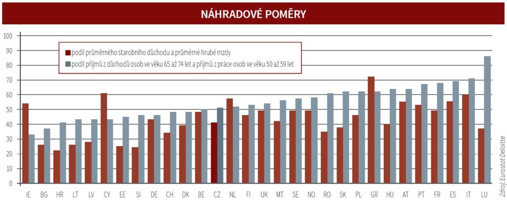 „Nejméně „bolestný“ přechod mezi příjmy před důchodem a během něj čeká penzisty v Lucembursku a Itálii. Naopak největší finanční šok zažívají irští a bulharští penzisté. Měřeno podílem průměrného důchodu a průměrné hrubé mzdy jsou na tom nejhůře důchodci v Chorvatsku (22 %), dále v pobaltských zemích, Slovinsku a Bulharsku. Nejlépe pak v Řecku (72 %), Kypru či Itálii. České důchody v průměru činí 41 % průměrné hrubé mzdy,“ uvádějí autoři důchodové studie Delloite David Marek a Václav Franče. Výše přiděleného důchodu samozřejmě závisí na tom, mezi kolik osob se celkové výdaje na důchody rozdělují. Například v Irsku před-stavují výdaje na důchody z hlediska procent HDP poměrně malou část rozpočtu, přesto tato země generuje třetí nejvyšší průměrný starobní důchod v Evropě a vůbec nejvyšší v EU.